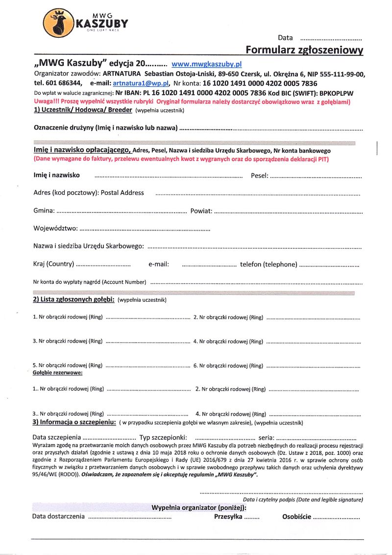 Termin przyjmowania gołębi 20.05.2025. Po uzodnieniu z organizatorem będzie możliwość dostarczenia gołębi później.