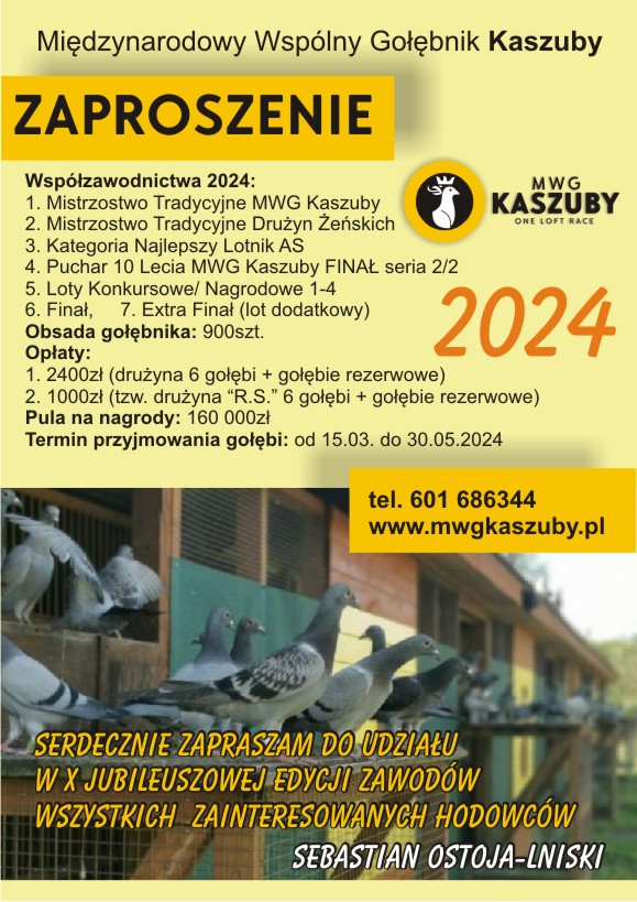 Spotkanie podsumowujące sezon 2024 odbędzie się 9 listopada (sobota) w Rytlu o godz. 17:00. Na spotkaniu zostaną wręczone nagrody oraz zostaną zaprezentowane najlepsze gołębie minionego sezonu. Poza tym jak co roku będzie przygotowany poczęstunek. Serdecznie zapraszam wszystkich uczestników do udziału w tym wydarzeniu, które m.in. ma integrować naszą małą społeczność. Proszę potwierdzić swój udział do 6.11.2024. Jest możliwość rezerwacji noclegów. Sebastian Ostoja-Lniski