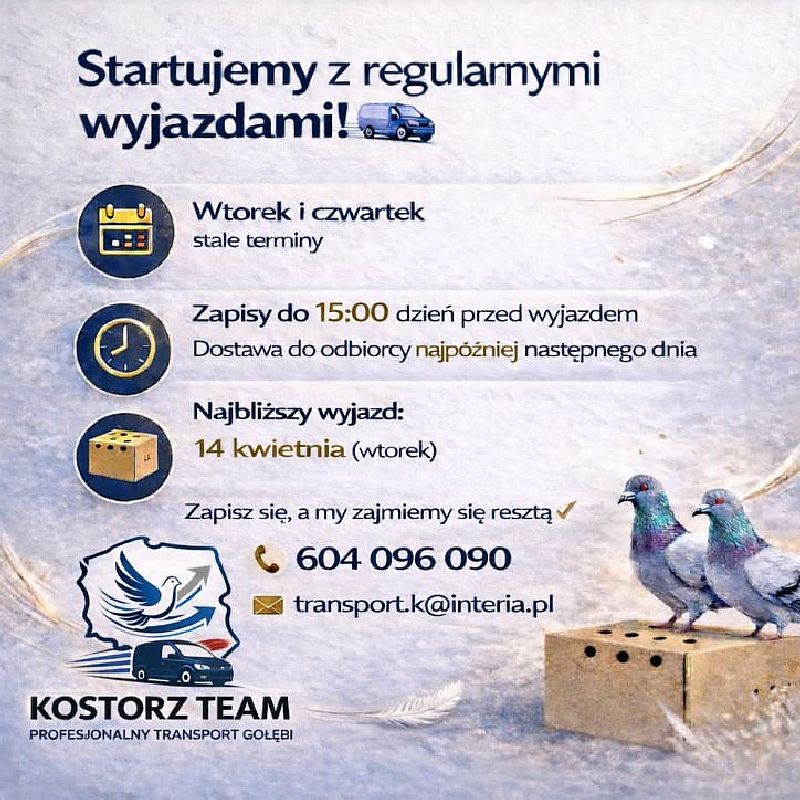 W nadchodzącym tygodniu gołębie zostaną zaszczepione na ospe. Do tej pory mamy minimalne straty w gołębiach, co świadczy również o jakości dostarczonych gołębi. W tym sezonie o ile gołębie dobrze będą trenować przy gołębniku szybciej niż zwykle rozpoczniemy loty treningowe. Wkrótce gołębie zostaną zaopatrzone w obrączki elektroniczne. Proszę tych uczestników, którzy do tej pory nie opłacili drużyn o dokonanie tej formalności. Sebastian Ostoja-Lniski