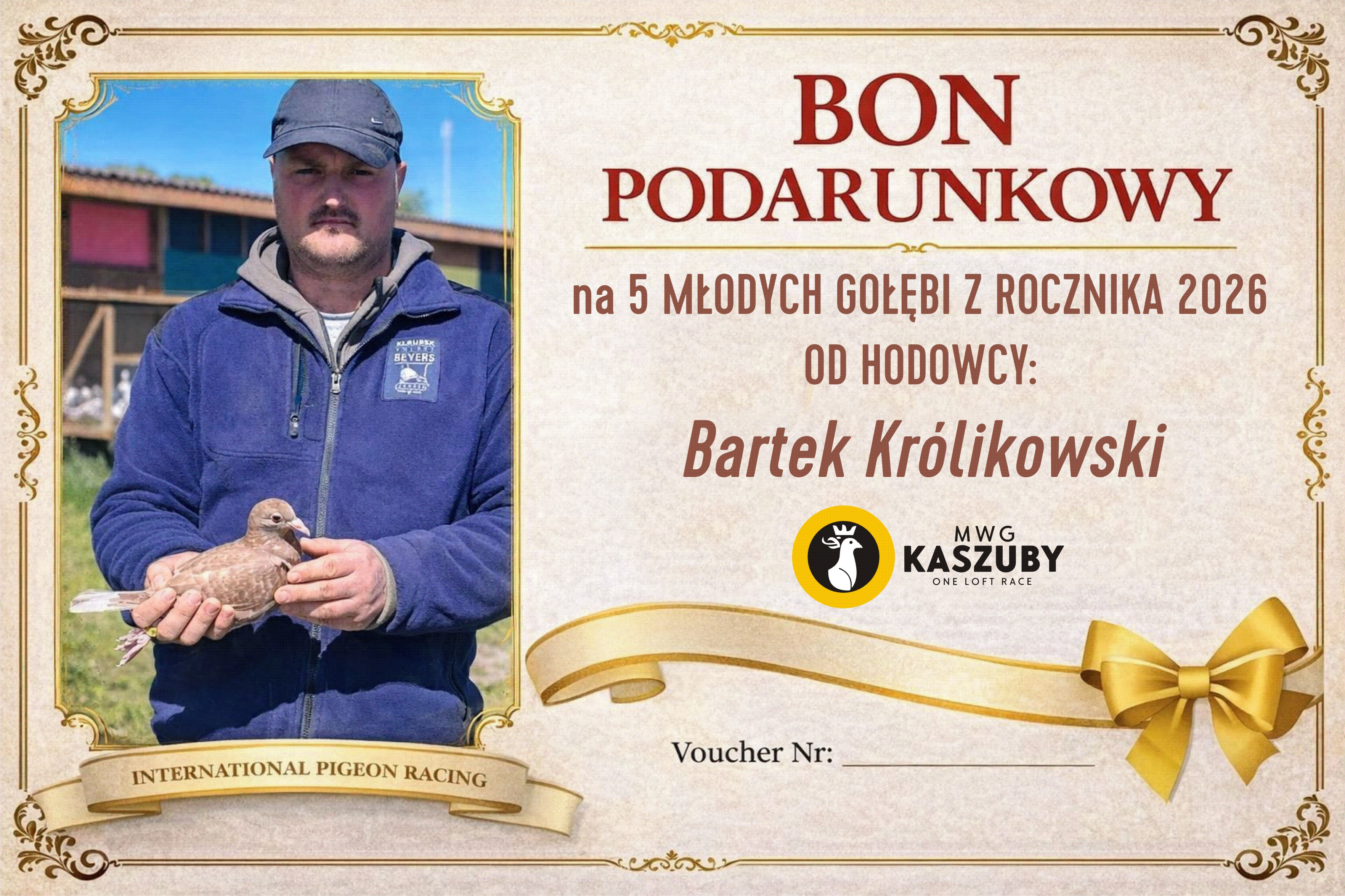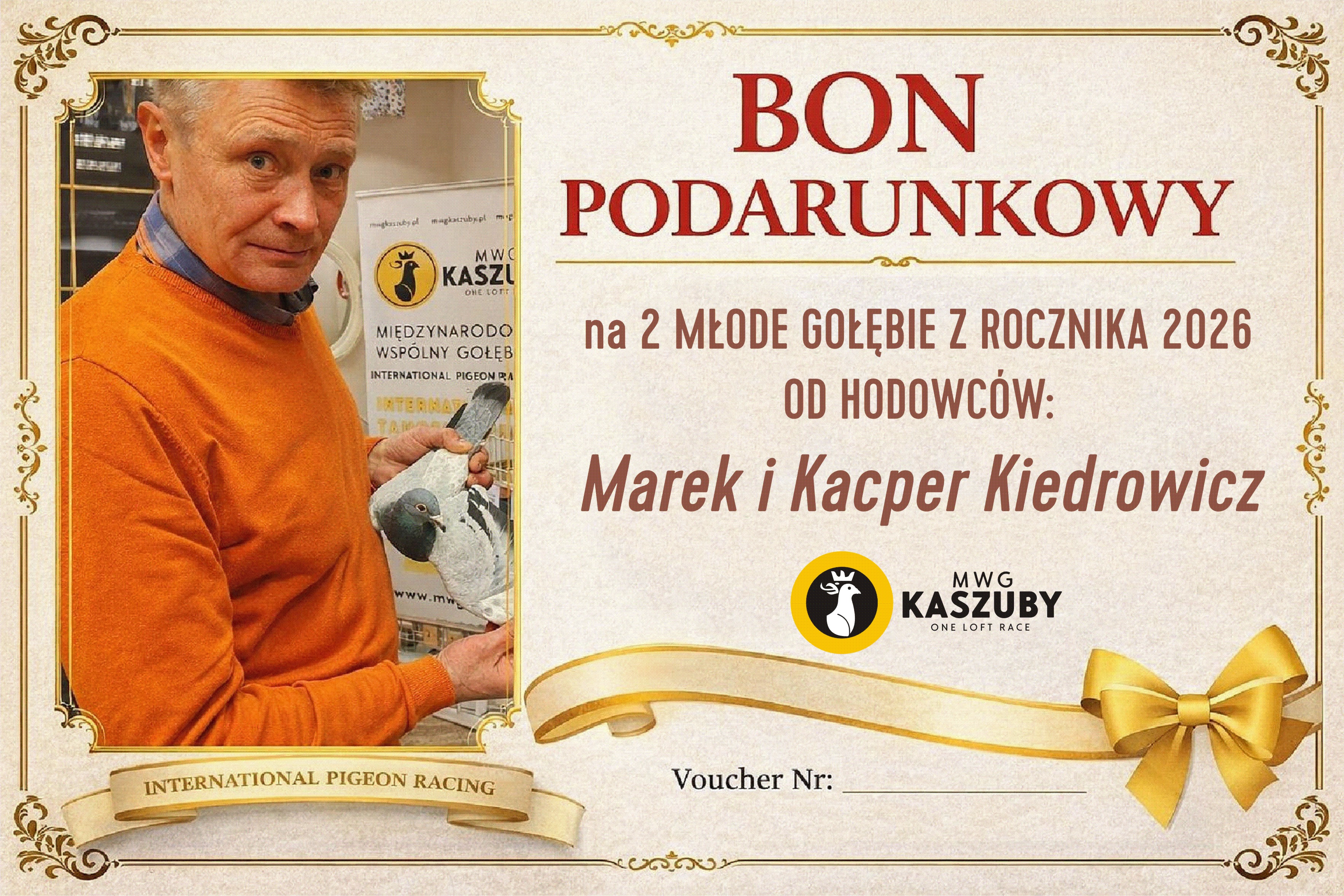 Poniżej Bony podarunkowe na młode gołębie z rocznika 2026 podarowane przez Marka i Kacpra Kiedrowicza oraz Bartka Królikowskiego. Bony będą losowane wśród uczestników, którzy zapiszą się na Wspólny Gołębnik do 4 stycznia 2026 oraz uiszczą zaliczkę w kwocie 400zł tytułem opłaty wstępnej. Gołębie będą mogły brać udział w rywalizacji na WG. Jako organizator z góry serdecznie dziękuję wymienionym hodowcom za podarowane gołębie.